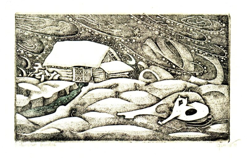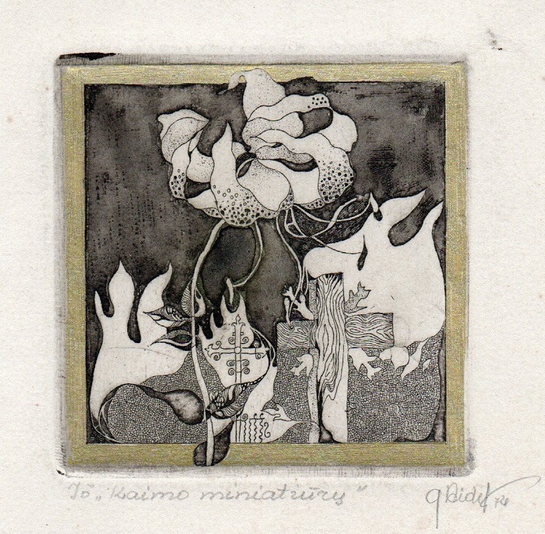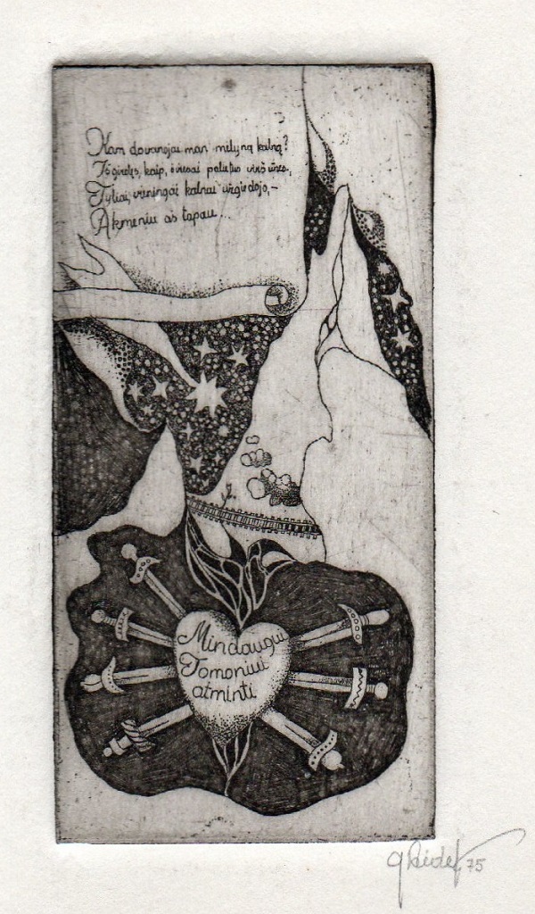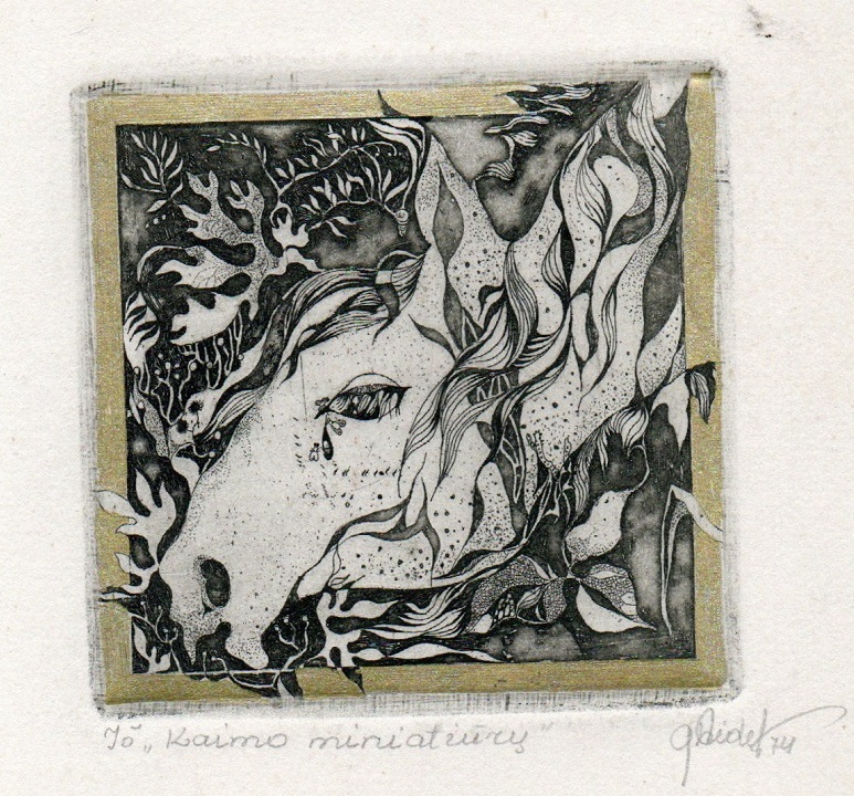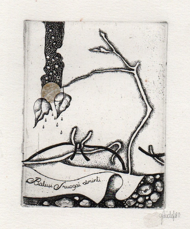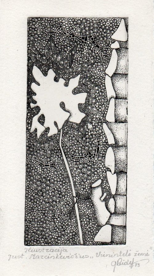 - Iliustracija A. Baltakio knygai „Strazdiškio elegijos“. 1977. C3. 10,5×13