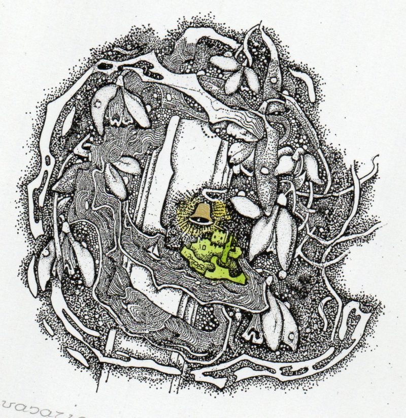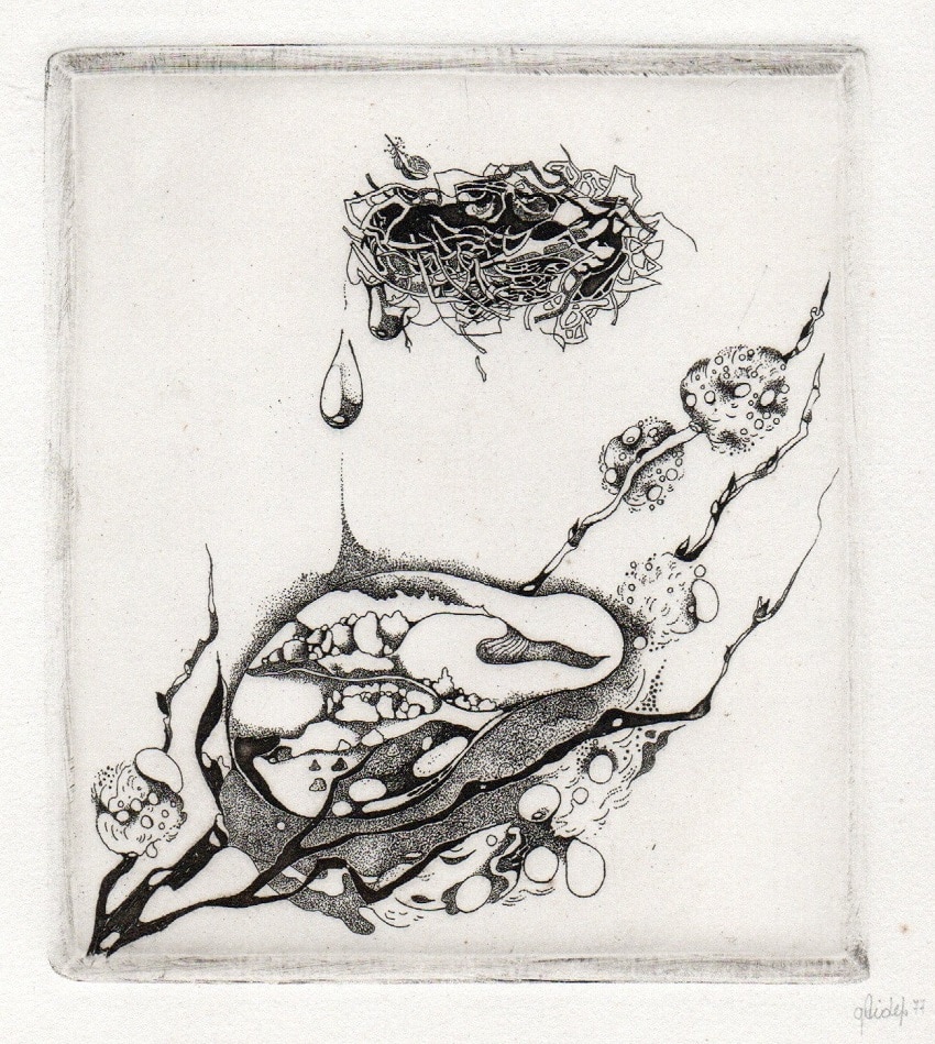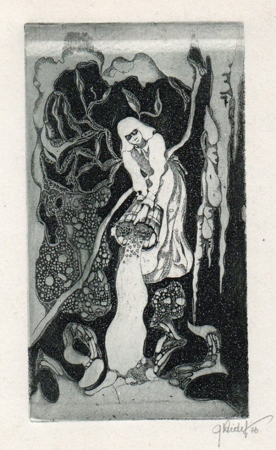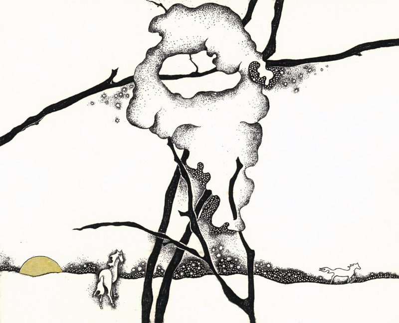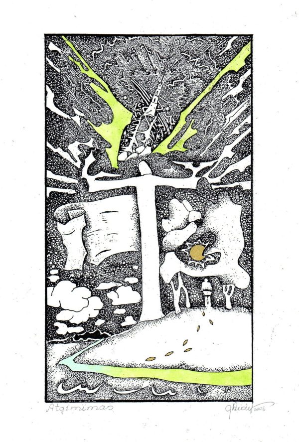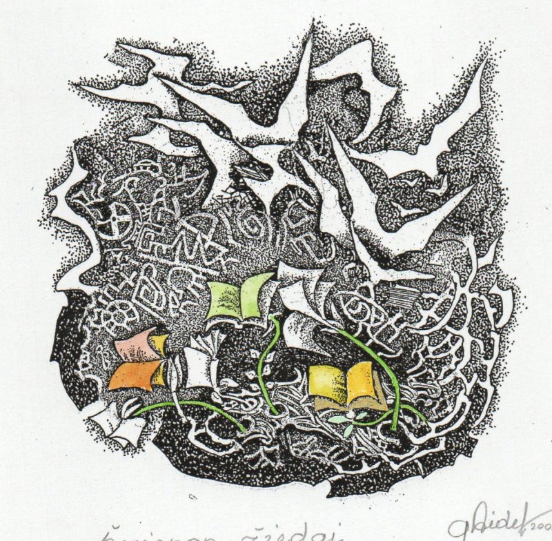 - Iliustracija A. Baltakio knygai „Strazdiškio elegijos“. 1977. C3. 10,5×13