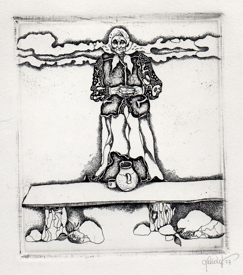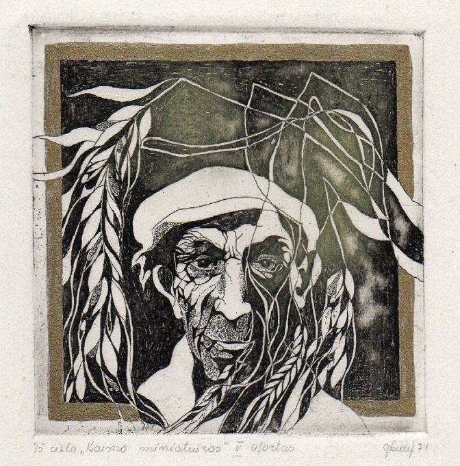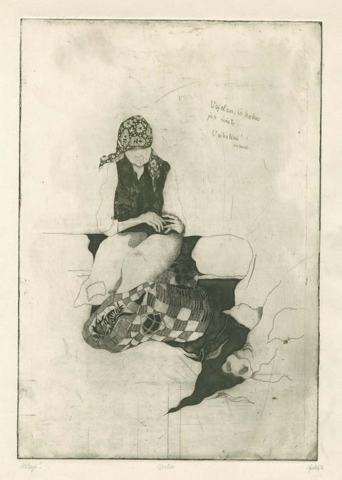- Iliustracija J. Marcinkevičiaus eilėms „O tėviške…“ Senolė. 1976. C3 col. 15×21