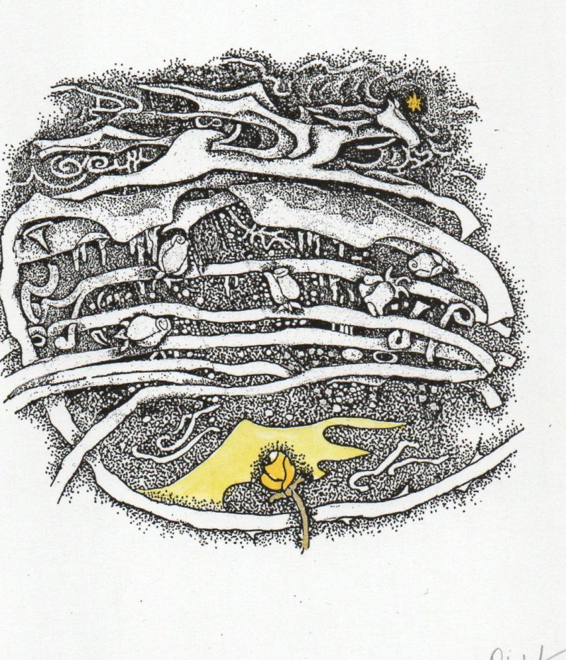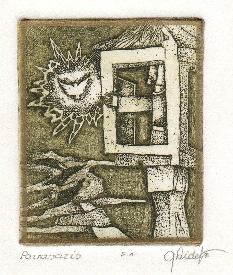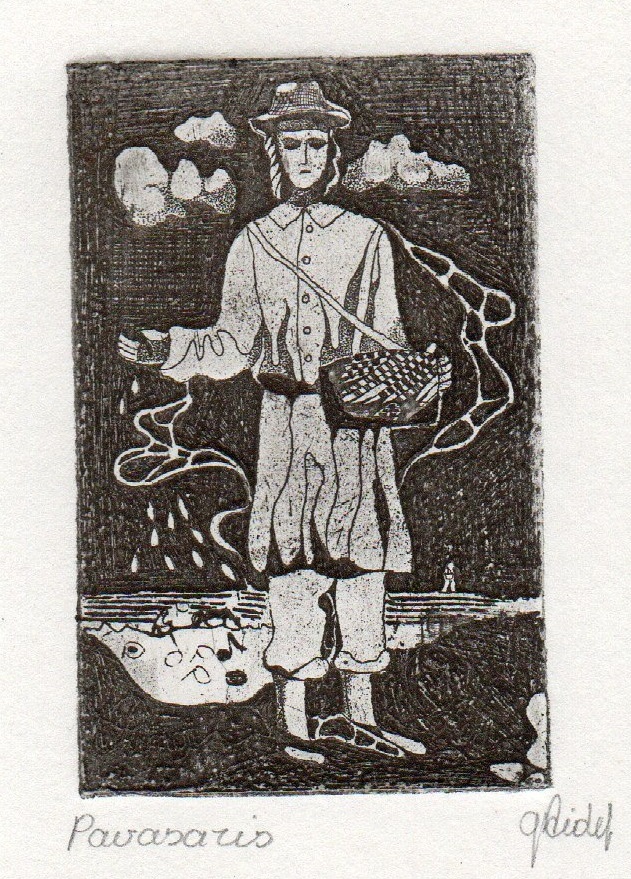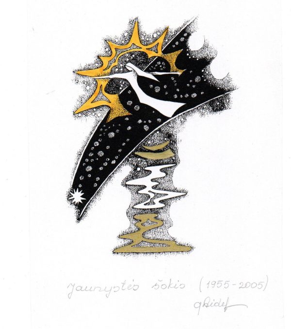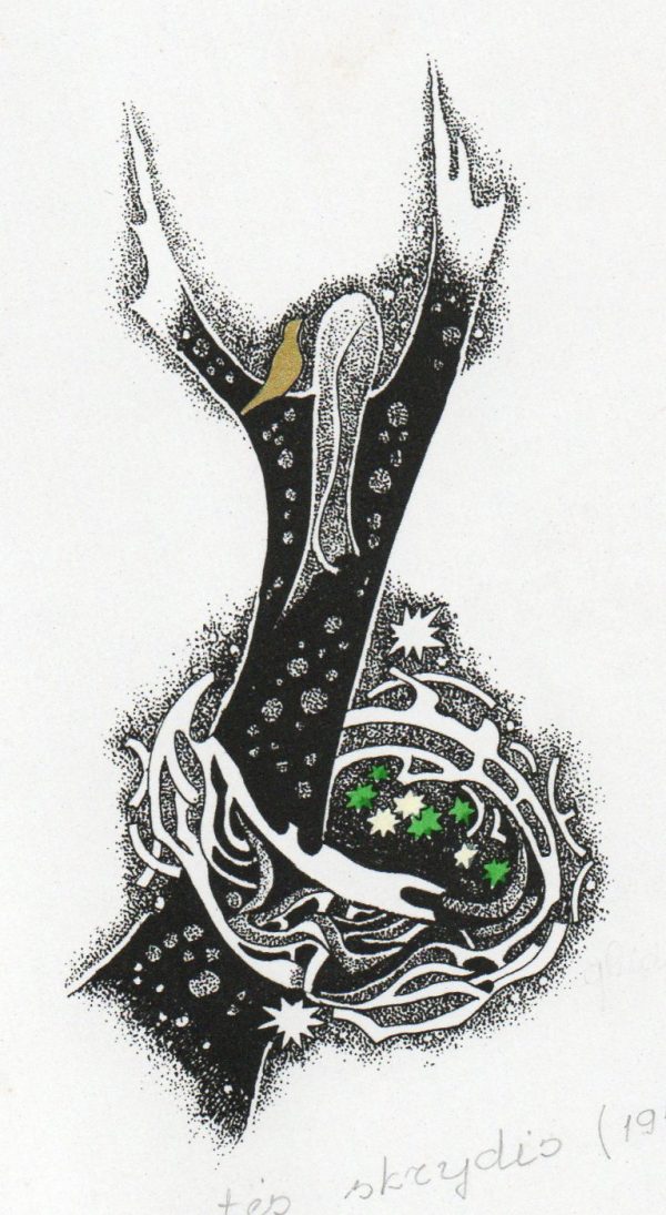 - Iliustracija „Vyturio giesmė” J. Marcinkevičiaus knygai „Gyvenimo švelnus prisiglaudimas“. 1977. C3. 9,6×11