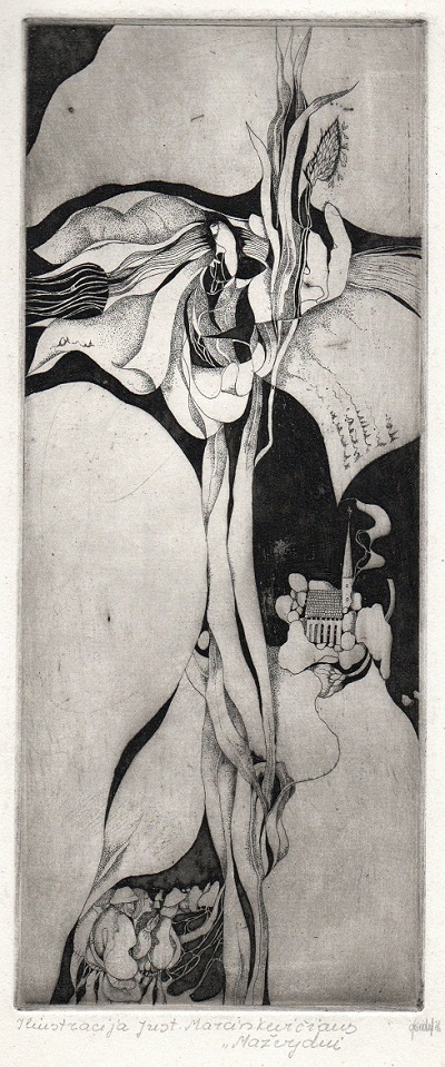 - Iliustracija J. Marcinkevičiaus „Mažvydui“ II. 1976. C3. 23,5×9,5